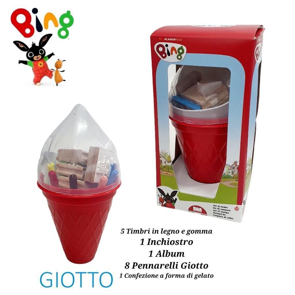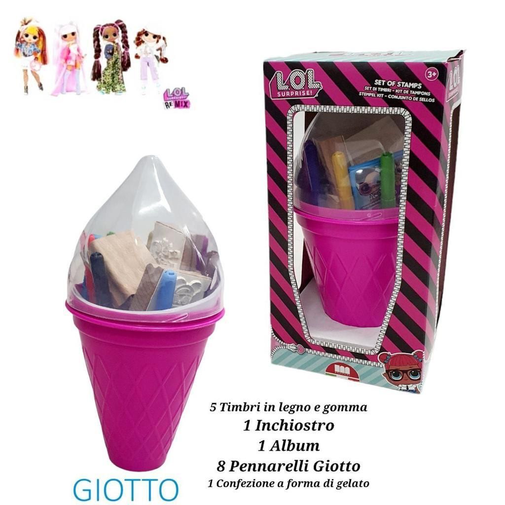 GIOTTO 5 Timbri in legno e gomma 1 Inchiostro 1 Album 8 Pennarelli Giotto 1 Confezione a forma di gelato MADE IN ITALY