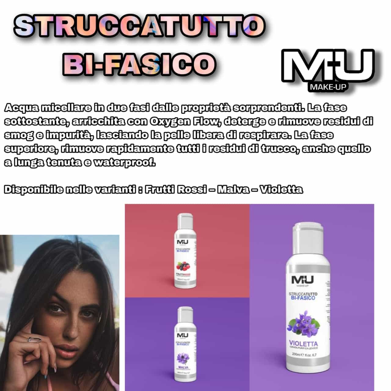 Lo STRUCCATUTTO BIFASICO della MU MAKE UP non è altro che un’acqua micellare bifasica, ovvero un prodotto che aiuta a pulire, idratare e detergere in profondità la pelle del viso. Ha una consistenza molto oleosa e basta pochissimo per attivare la sua azione rimuovi-makeup. L’unica accortezza è quella di agitarlo bene prima dell’uso, così da attivare la sua multifunzione: il bifasico, infatti, è composto per metà da acqua e per l’altra metà di olio, per questo motivo sono perfetti per prodotti waterproof e a lunga tenuta, difficili da rimuovere con un normale struccante. E’ disponibile in 3 varianti, che si differenziano tra loro non solo per il profumo, ma anche per l’azione che hanno sulla pelle: